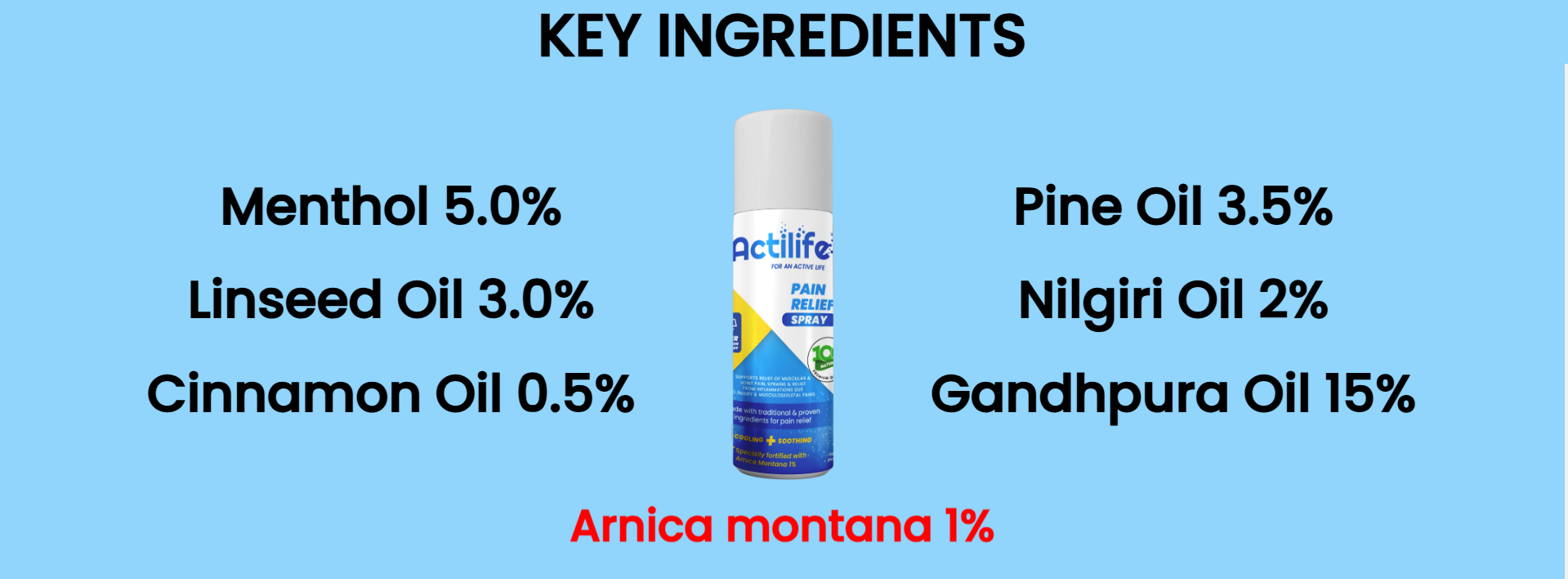 Actilife Pain Relief Spray® is a strong but natural pain relief spray that starts work rapidly after applying on the affected areas. It is made with natural combination of 1% Arnica Montana & 6 other powerful pain relief agents like Peppermint Oil, Cinnamon Oil, Gandhpura Oil, Pine Oil, Linseed Oil & Nilgiri Oil.